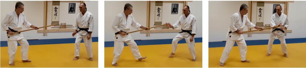 Uke is avoiding and grasping the jo either with 2 hands or 1 hand.